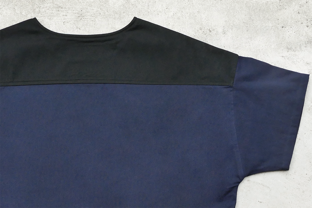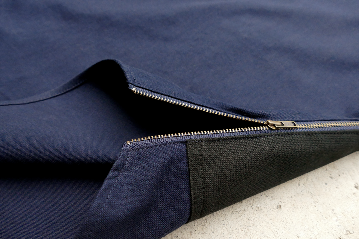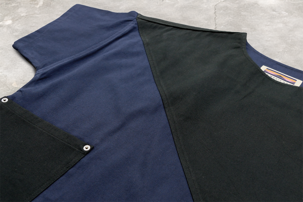 カスタムコットンタープ製作時に出た端材を再利用し、ネイビー×ブラックのバイカラーで仕上げた、サステナブルかつ個性的な一着です。